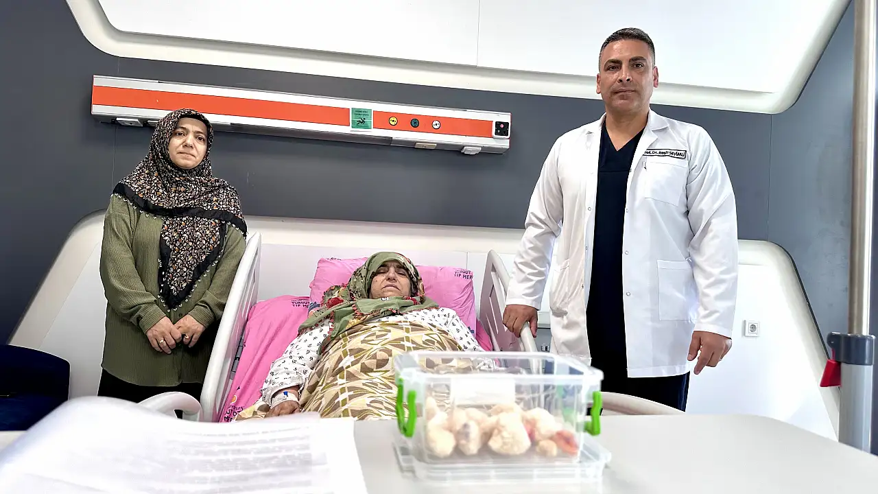 Malatya'da 73 yaşındaki Elif Büyükbirer'in yıllardır süren diz ağrısının nedeni yapılan tetkiklerle ortaya çıktı. Turgut Özal Tıp Merkezi'nde gerçekleştirilen ameliyatta Büyükbirer'in dizinden 24 adet taşlaşmış tümör çıkarıldı.