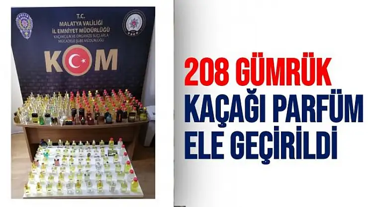 Malatya’da, yurt dışından kaçak olarak Türkiye’ye sokulan 208 adet gümrük kaçağı parfüm ele geçirildi. Olayla ilgili bir şahıs hakkında yasal işlem yapıldı.
