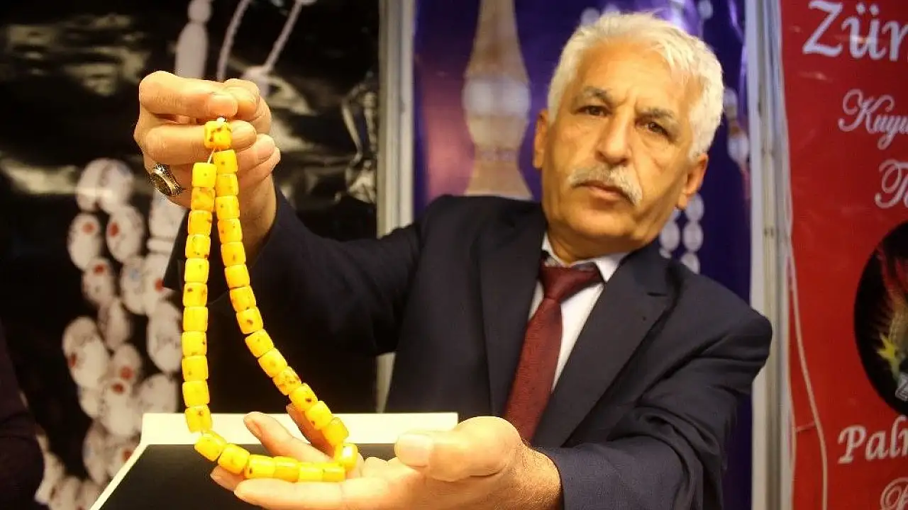 Adıyaman’da açılan fuarda sergilenen birbirinden değerli taş ve malzemelerden yapılan tespihlerin fiyatı dudak uçurtuyor. Zultanit, zümrüt, elmas, yakut, fil dişi gibi değerli malzeme ve taşlardan yapılan tespihleri görenler hayranlıklarını gizleyemiyor.