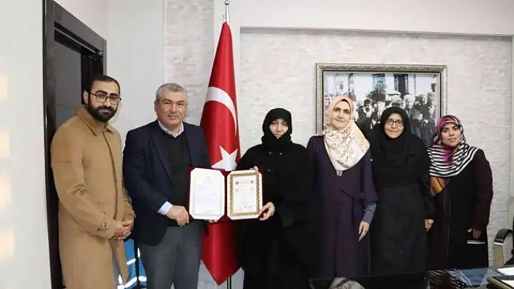 Altunkaya hafızlığını tamamlayan Kur´an kursu öğreticisi Fatma Gül Güven´i tebrik ederek belgesini takdim etti.