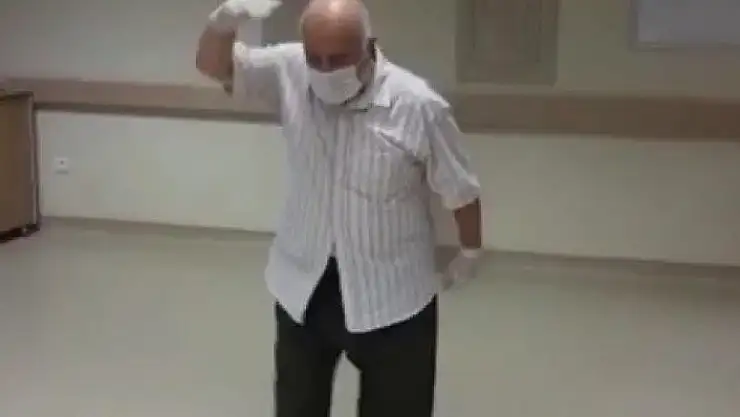 Sivas´ta 14 Ağustos tarihinde Covid-19 tanısıyla eşi Emine Yılmaz (67) ile tedavi altına alınan Sami Yılmaz bugün tedavilerinin tamamlanmasının ardından sağlıklarına kavuşarak taburcu edildi. Sami Yılmaz Covid-19´u yenmenin mutluluğu ile hastane koridorlarında Harmandalı oynadı. Bu anlar yakınları tarafından cep telefonu ile kaydedildi.