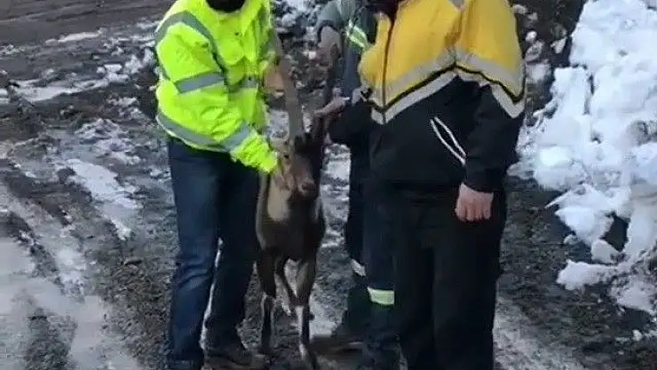 Adıyaman’da kar ve soğuk nedeniyle aç kalan yaban keçisi şantiyeye girdi. İşçilerin fark ettiği keçi, kovalamacanın ardından yakalanarak, doğaya salındı.