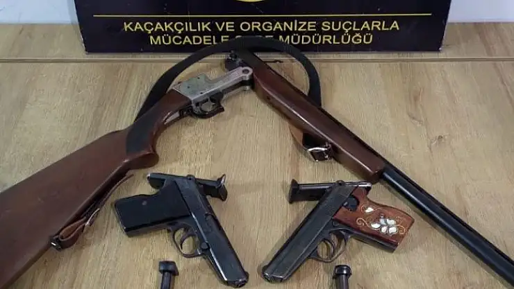 Polis ekipleri kaçakçılık fiillerinin önlenmesi ve tespit edilmesine yönelik olarak yapılan çalışmalar kapsamında il merkezimizde bir evde yapılan aramada 2 adet 7.65 ruhsatsız tabanca, 1 adet ruhsatsız av tüfeği, 4 adet şarjör, 6 adet fişek ele geçirildi. Şüpheli A.İ. isimli şahıs hakkında adli işlem başlatıldı.