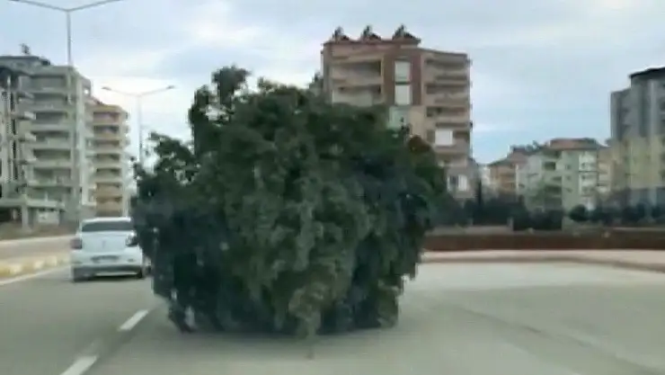 Adıyaman 3. Çevre yolunda bir traktör römorkuna yüklenen çam ağacı ilginç görüntü ortaya çıkarttı. Römorka yüklenen ancak çam ağacının büyüklüğünden dolayı römorkun görünmediği traktör tehlikeli bir şekilde trafikte ilerledi.