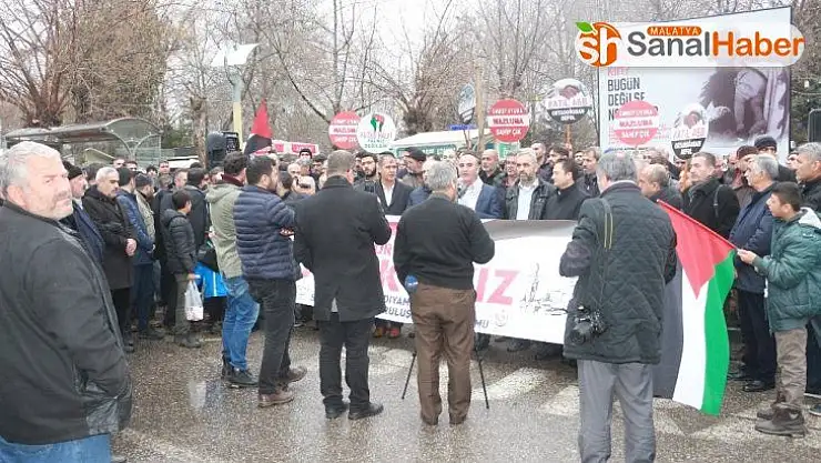 Adıyaman Sivil Toplum Kuruluşları adına açıklamayı okuyan Memur- Sen İl Başkanı Ali Deniz, “Dün gece yapılan bir toplantı sonrasında, dünyanın sömürgeci ve emperyalist gücü ABD’nin Başkanı Donald Trump ve işgalci terörist İsrail’in Başbakanı Netanyahu, yüzyılın barış planı adıyla yüzyılın utanç planını açıkladılar. Bu sözde anlaşma ile kendi ülkelerinin iç siyasetinde batağa girmiş olan bu iki meczup lider, tarihin en aptal manevrası ile skandallarına bir yenisini daha eklemişlerdir. Sözde anlaşmanın tanıtıldığı toplantıda yer alan Umman, Bahreyn ve Birleşik Arap Emirlikleri ise bu tarihi ihaneti, bir ömür sırtlarında taşıyacaklardır.
