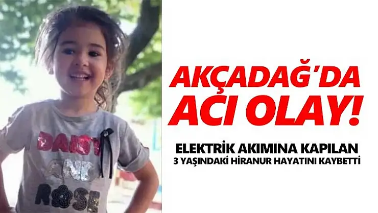 Olay, Akçadağ ilçesine bağlı Kurtuşağı Mahallesi´nde meydana geldi. İddiaya göre, 3 yaşındaki küçük Hiranur Dilek arkadaşları ile evlerinin önünde oyun oynarken bölgede bulunan aydınlatma direğinden akıma kapıldı. Durumun fark edilmesinin ardından hastaneye kaldırılan küçük kız tüm müdahalelere rağmen kurtarılamayarak hayatını kaybetti.