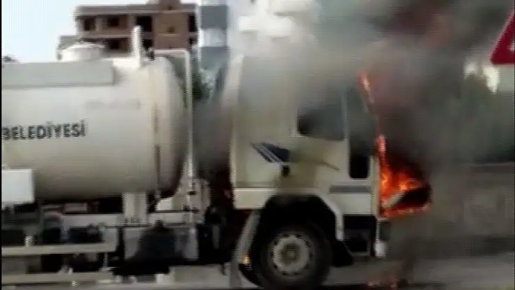 Adıyaman Belediyesine ait vidanjör çalışırken alev alev yandı. Yanan vidanjör bomba gibi patladı.