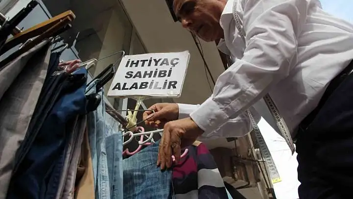 Elazığ´da 68 yaşındaki bir terzi, hem kendinin hem vatandaşın getirdiği ve kendisinin tamiratını yaptığı kıyafetleri ´Askıda Kıyafet´ kampanyasıyla 10 yıldır ihtiyaç sahiplerine ulaştırıyor.