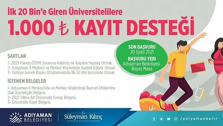 Adıyaman Belediyesi, bu yıl üniversite sınavında ilk 20 bine giren Adıyaman merkez ilçe ve merkeze bağlı köylerde ikamet eden öğrencilere bin TL kayıt desteğinde bulunacak.