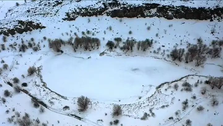 Sülüklü gölün buz tutması kartpostallık bir görüntü oluştururken, bölge dron ile görüntülendi.