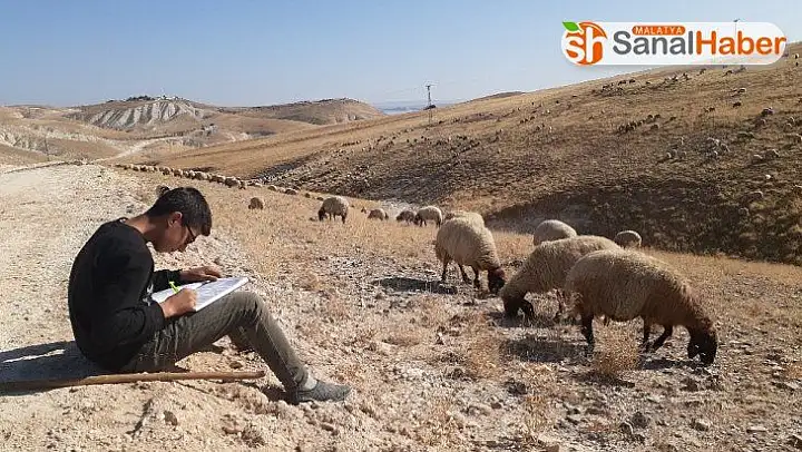 Adıyaman'ın Samsat ilçesinde ara tatili fırsat bilen 15 yaşındaki lise öğrencisi Yüksel Gökdemir, hem çobanlık yapıyor hem de ders çalışıyor.