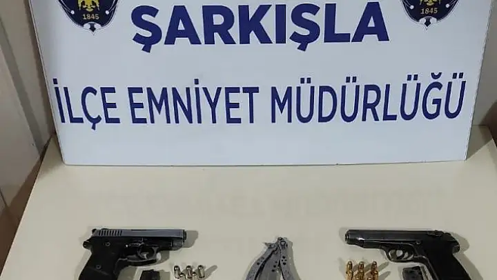 Sivas´ta 'Uyuşturucu veya Uyarıcı Madde Ticareti Yapma' suçundan araması bulunan bir kişi Şarkışla İlçe Emniyet Müdürlüğü Suç Önleme ve Soruşturma Büro Amirliği ekipleri tarafından yakalandı. Şahsın üzerinde yapılan aramada; 1 adet 7.65mm çapında ruhsatsız tabanca, bir ruhsatsız kurusıkı tabanca ve taşınması yasak olan bıçak ele geçirildi. Şahıs hakkında 6136 Sayılı 'Ateşli Silahlar ve Bıçaklar ile Diğer Aletler Hakkında Kanuna Muhalefet' suçlaması ile yasal işlem başlatıldı. Önceden 'Uyuşturucu veya Uyarıcı Madde Ticareti yapma' suçundan aranmakta olan şahıs sevk edildiği adli mercilerce tutuklanarak cezaevine gönderildi.