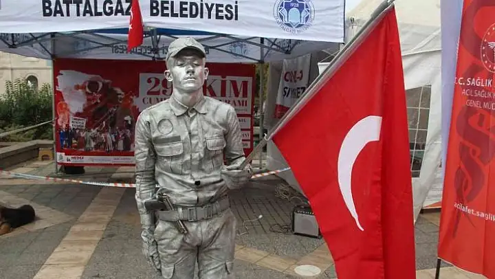 Malatya Soykan Meydanı´nda canlı heykel gösterisine sabah saatlerinde başlayan Tiyatro oyuncusu ve yönetmen İbrahim Şahin Uyumaz, 24 saat boyunca canlı heykel performansı sergileyeceğini söyledi. Asker selamı veren Uyumaz, bu alanda dünya rekoru kırmayı hedeflediğini vurguladı.