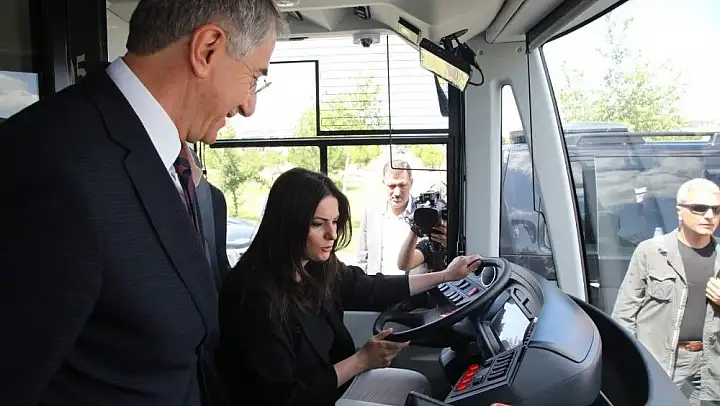 Çalışma ve Sosyal Güvenlik Bakanı Jülide Sarıeroğlu, dünyada ilk defa Elazığ'da kullanılmaya başlanan ELBÜS'leri inceleyerek, direksiyonun başına geçti.