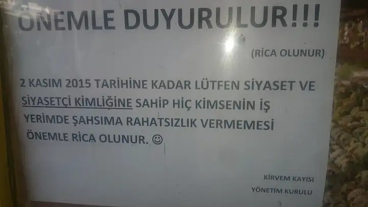 Mısır Çarşısında Hediye Kayısı işi yapan esnaf Ali Fuat ÖZDEMİR yazdığı not şöyle: ' 2 Kasım 2015 tarihine kadar lütfen siyaset ve siyasetçi kimliğine sahip hiç kimsenin iş yerimde şahsıma rahatsızlık vermemesi rica olunur. Kirvem Kayısı'