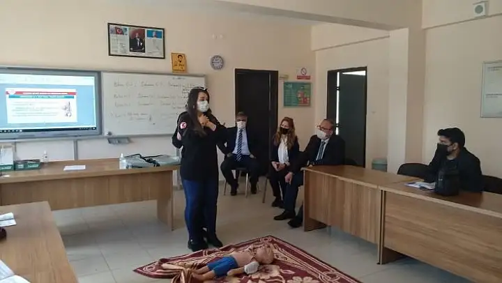 Milli Eğitim Müdürü Ahmet Alagöz, Bakanlığın öğrenci, öğretmen ve velilerimizde ilk yardım bilincinin geliştirilmesi, yaralanma ve sakatlanmaların azaltılması amacıyla başlattığı, 'Çocuklarımız İlk Yardımla Daha Güvende' projesi kapsamında Yunus Emre Mesleki ve Teknik Anadolu Lisesinde verilen ilk yardım kursunu ziyaret etti.
