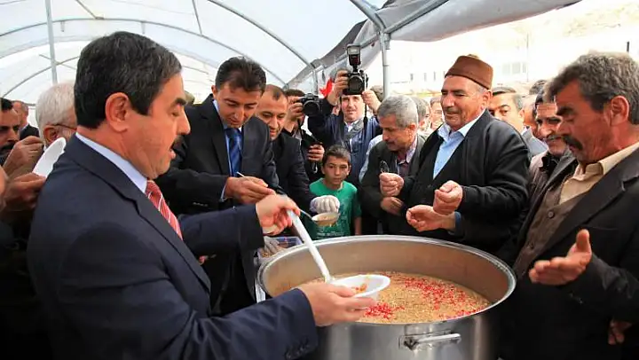 Vaiz İbrahim Ateş'in dua ettiği programda Kaymakam Ali Türk ve Başkan Eser vatandaşlara aşure dağıttı.
