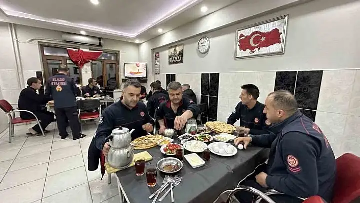 Kahramanmaraş merkezli yaşanan depremde, depremzede olmalarına rağmen ailesini ve çocuklarını bırakarak Malatya´ya yardıma koşan Elazığ İtfaiyesi, Ramazan ayını buruk bir sevinçle karşıladı. Yangın, deprem, sel ve çığ gibi doğal afetlerin yanı sıra trafik kazalarında da görev alan itfaiye erleri, sahur için İtfaiye Daire Müdürlüğündeki istasyonda hazırlık yaptı. İstasyonda, 24 saat görev başında bekleyen itfaiyeciler, sahur için mutfağa girerek çay demleyip kahvaltılıkları yemek masasına servis etti. Pidelerin getirilmesinin ardından masaya oturan itfaiye erleri, dua eşliğinde sahurlarını yaptı. Ekipler, sahurun ardından yine mesailerine kaldıkları yerden devam etti.