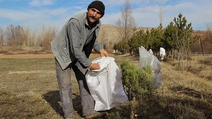 Sivas'ta çiftçilik yapan 32 yaşındaki Recep İnce, diktiği çam fidanları soğuk havadan etkilenmesin diye çözüm olarak fidanları torbayla sararak koruma altına aldı.