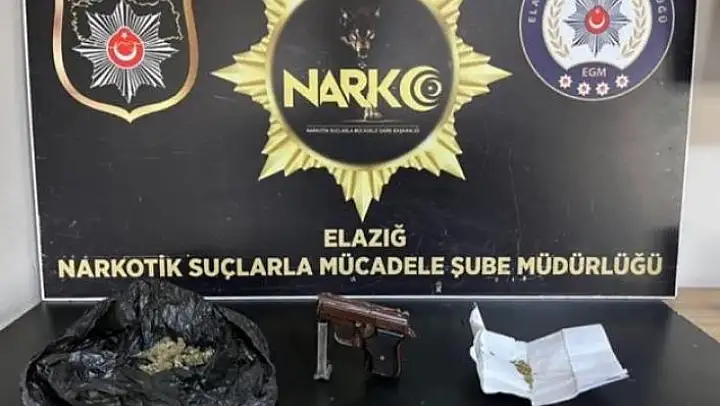 Narkotik Suçlarla Mücadele Daire Başkanlığı koordinesinde ülke genelinde başlatılan NARKOGÜÇ uygulamaları çerçevesinde Elazığ Emniyet Müdürlüğü Narkotik Suçlarla Mücadele Şube Müdürlüğü ekipleri tarafından çalışma yapıldı. Çalışmada, şüpheliler B.O. H.A.A. ve H.Y.´nin ikametlerinde arama yapıldı. Aramada, 24.68 gram esrar maddesi, 0,25 gram toz esrar ve 1 adet ruhsatsız tabanca ele geçirildi.