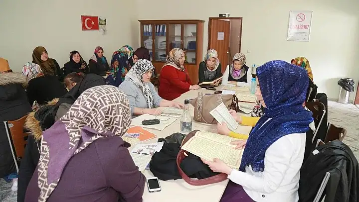 Mustafapaşa Mahallesinde bulunan belediyeye ait Spor ve Yaşam Merkezine gelen kadınlar, TSK'nın Afrin'deki terör unsurlarına yönelik düzenlediği meskun mahal operasyonunda görev alan Mehmetçik için Kur'an-ı Kerim okuyarak, dua etti.