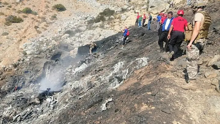 Yanarak küle dönen uçağın enkazına ulaşan ekipler, çalışmalarını sürdürüyor.
