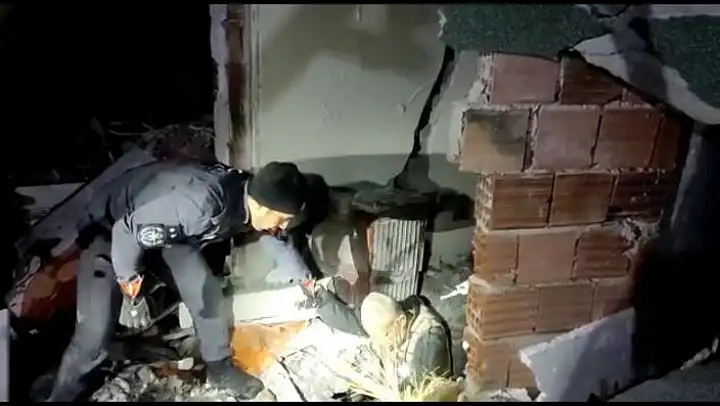 Kahramanmaraş´ta meydana gelen depremler nedeniyle Malatya´da çöken bir binada mahsur kalan 4 kişilik aileyi dalgıç polisler kurtardı. Kurtarılan aileden yaşlı teyzeyi polisler sırtında taşıdı.
