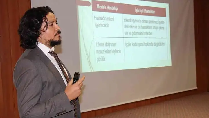 FÜ Hastanesi konferans salonunda düzenlenen eğitime, çok sayıda hastane çalışanı katıldı. FÜ Tıp Fakültesi Aile Hekimliği Ana Bilim Dalı Öğretim Üyesi Doç. Dr. Burkay Yakar tarafından FÜ Hastanesi çalışanlarına meslek hastalıklarının önemi ile ilgili eğitim semineri verildi. Çalışma hayatının insan yaşamının vazgeçilmez bir parçası olduğunu belirten Doç. Dr. Burkay Yakar, 'İnsanlar, günlerinin büyük bir kısmını ve günün en aktif zamanını çalışma ortamlarında geçiriyor. Her ne kadar çalışma ortamları hayatımızın bir parçası olsa da çalışanın sağlığını bozacak tehlike ve riskler taşıması nedeniyle bedensel, ruhsal ve sosyal sağlığı etkileyebiliyor. İnsanların çalıştıkları işe özgü olarak bazı hastalık ve rahatsızlıklar açısından risk altında olabiliyor. Bireylerin çalışma ortamındaki riskler nedeniyle ortaya çıkan meslek hastalıklar, Dünya Sağlık Örgütü (WHO) ve Uluslararası Çalışma Örgütü (ILO) tarafından çalışılan işe özgü bir neden sonuç, etki tepki ilişkisinin ortaya konabildiği hastalıklar grubu olarak tanımlanıyor' dedi.