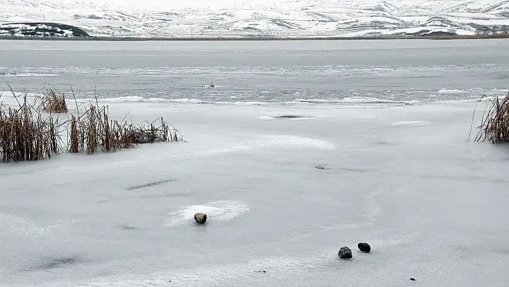 Buz tutan gölün çevresinde kartposttalık manzaralar oluştu. Buz tutan gölde yaşayan sakarmekeler ise göl çevresinde buz üzerinden açılan deliklerden suya girebiliyor.