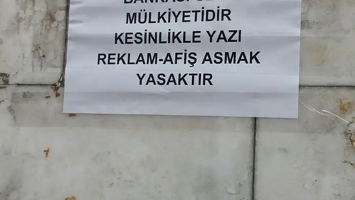 Sivas'ta şehir merkezinde bulunan bir banka şubesi çalışanları banka binasının duvarına asılan ilanların önünü kesebilmek için aynı duvara ilan asmanın yasak olduğunu belirten bir ilan astı. Duvara asılan 'Bu duvar bankanın özel mülkiyetidir. Kesinlikle yazı, reklam ve afiş asmak yasaktır' yazılı ilan görenleri hem güldürdü hem de düşündürdü.