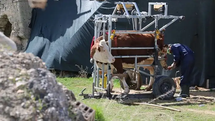 Elazığ´da büyükbaş hayvanların tırnak kesim ve bakımları, özel olarak hazırlanan seyyar araçla veteriner hekim tarafından köy köy gezilerek yapılıyor.