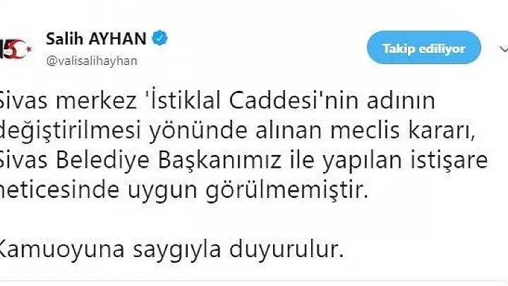 Sivas Belediyesi Meclisinin, Sivas'ta şehir merkezinde bulunan İstiklal Caddesi'nin ismini 'Şehit Mursi Caddesi' olarak değiştirilmesine yönelik karar alması tepkilere neden olmuştu. Tepkilerde ismin yeni açılacak başka bir caddeye verilmesi, İstiklal isminin değiştirilmemesi yönünde gerçekleşti. Sivas Valisi Salih Ayhan, sosyal medya paylaşımı ile sosyal medyada süren isim tartışmalarına noktayı koydu. Ayhan paylaşımında, 'Sivas Merkez İstiklal Caddesinin adının değiştirilmesine yönelik alınan Belediye meclis kararı, Belediye başkanımız ile yapılan istişare neticesinde uygun görülmemiştir.' Dedi.