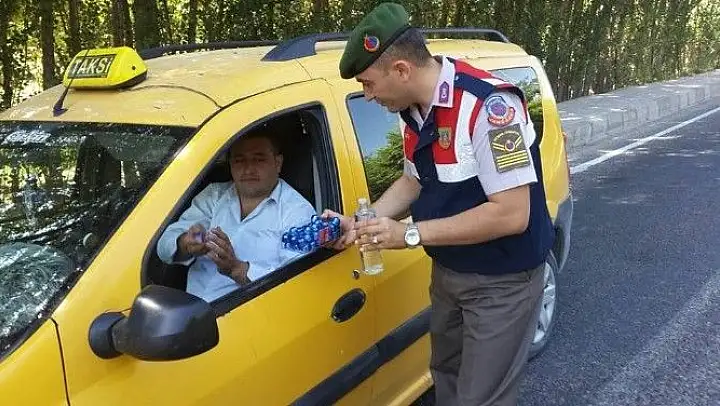 Kurban Bayramı münasebetiyle uygulama yapan Jandarma Trafik Timleri araçları durdurup uygulama yaptıktan sonra sürücülere ve yolculara kolonya ve şeker ikram ederek bayramlarını kutladılar.