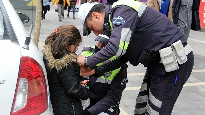 Sivas'ta sokakta kağıt mendil satarken yetişkinlerin sorularından sıkılıp ağlamaya başlayan kız çocuğunu polis memurları sakinleştirdi.