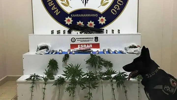Edinilen bilgiye göre, Kahramanmaraş Emniyet Müdürlüğü Narkotik Suçlarla Mücadele Şubesi ekipleri, Dulkadiroğlu ilçesi Bağlarbaşı Mahallesi'nde bir eve düzenlenen operasyonda 13 ayrı paket ve 3 ayrı poşet halinde toplam 1 kilo 63 gram esrar maddesi ile 16 kök kenevir bitkisi ele geçirdi. Evde yapılan aramada ayrıca 1 adet ruhsatsız tabanca, tabancaya ait 7 adet 9 mm çaplı mermi, 1 adet ruhsatsız pompalı av tüfeği ve tüfeğe ait 19 adet dolu fişek ele geçirildi. Gözaltına alınan Fahri Ç. (25) hakkında 'uyuşturucu madde ticareti ve ruhsatsız silah bulundurmak' suçlarından işlem başlatıldı.