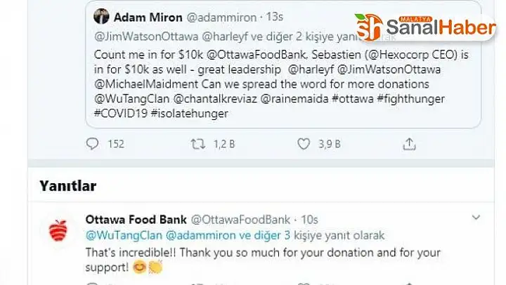 Kanada'nın başkentinde yardım kuruluşu olan Ottawa Gıda Bankası (ücretsiz gıda yardımı deposu), korona virüsü nedeniyle sosyal medya kampanyası başlattı. Başlatılan kampanya kapsamında 24 saatte ünlü hip hop grubu Wu-Tang Clan da dahil olmak üzere gelen büyük bağışların sonucu 170 bin doların üzerinde para topladı. Bağışlardaki artış, Ottawa Belediye Başkanı Jim Watson, e-ticaret şirketi Shopify Direktörü Harley Finkelstein ve Ottawa Gıda Bankası CEO'su Michael Maidment'in yer aldığı internet yayınından sonra gerçekleşti.
