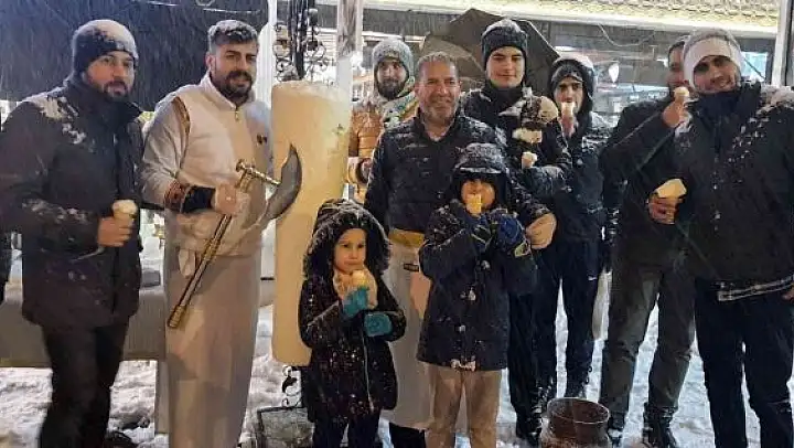 Kahramanmaraş´ta kar yağışı ile beraber bir dondurmacı kar altında baltayla kestiği dondurmayı vatandaşlara ikram etti.