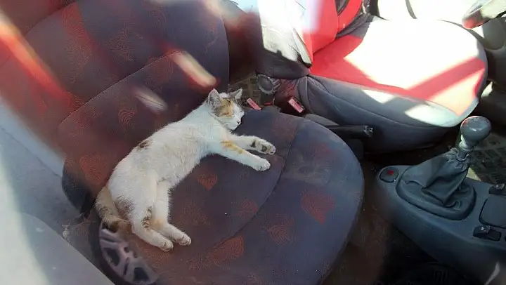 Sivas'ta bir vatandaş, kaybettiği kedisini, vatandaşların polise yaptığı ihbar üzerine otomobilinin koltuğunda mışıl mışıl uyurken buldu. Kedinin ve aracın sahibi Emre Yalçın, 'Sabah arabayla uğraşıyordum. İçine girmiş. Ben de arıyordum' dedi.