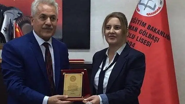Umut ve Yaşam Derneği Adıyaman Gönüllü Temsilcisi Nuran Balcı'ya ne Gölbaşı Anadolu Lisesi Okul Müdürü Veysel Bilen tarafından teşekkür plaketi verildi.