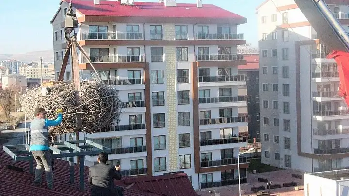 Sivas'ta Vali Davut Gül'ün talimatıyla bir ortaokulun çatısındaki leylek yuvası vinçle alınarak, daha güvenli olan ilkokul binasının çatısına taşındı.