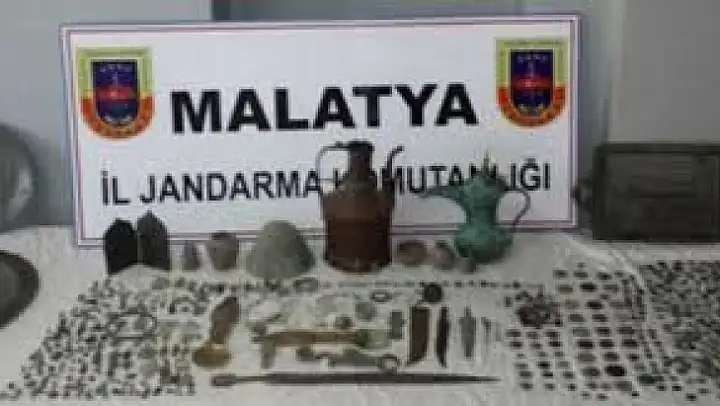 Edinilen bilgiye göre, Malatya İl Jandarma Komutanlığı ekipleri, Pütürge ve Doğanyol ilçelerinde tarihi eser kaçakçılığı yaptığı tespit edilen 3 şahsın evlerine 24 Kasım'da baskın yaptı. Yapılan aramalarda 82 adet İslami döneme ait bronz-bakır sikke, 22 adet Doğu Roma dönemine ait bronz-bakır sikke, 3 adet Osmanlı dönemine ait gümüş kaplama bakır sikke, 12 adet dönemi anlaşılmayan bronz-gümüş-aliminyüm sikke, 17 adet Orta Çağ dönemine ait demir-bronz ok ucu, 10 adet Orta Çağ dönemine ait bronz yüzük ve parçaları, 1 adet Doğu Roma dönemine ait kurşun mühür, 2 adet Orta Çağ dönemine ait bronz anahtar, 1 adet Orta Çağ dönemine ait bronz zar, 1 adet Orta Çağ dönemine ait bronz yüzük, 9 adet Orta Çağ dönemine ait bronz aplik, 27 adet Orta Çağ dönemine ait cam-bronz bilezik parçaları, 1 adet Orta Çağ dönemine ait bronz vazo, 2 adet dönemi anlaşılmayan sarı metal sikke,1 adet dönemi anlaşılmayan alüminyum sikke, 1 adet dönemi anlaşılmayan tunç sikke, 5 adet dönemi anlaşılmayan tunç para ve 56 adet dönemi anlaşılmayan bronz-bakır metal parçaları olmak üzere toplam 253 adet tarihi eser ele geçirildi. Yapılan aramalarda ayrıca 1 adet Cumhuriyet dönemine ait tunç kahve değirmeni, 1 adet el dedektörü, şahıslara ait 4 adet cep telefonu ve 4 adet simkart ele geçirildi. Adli makamların talimatıyla söz konusu malzemelere el konuldu. Gözaltına alınan 3 zanlı ise çıkarıldıkları mahkemece adli kontrol şartıyla serbest bırakıldı.
