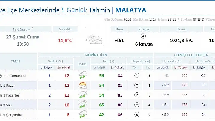 Meteoroloji Genel Müdürlüğü verilerine göre Malatya için 5 Günlük Hava Tahmin raporu.