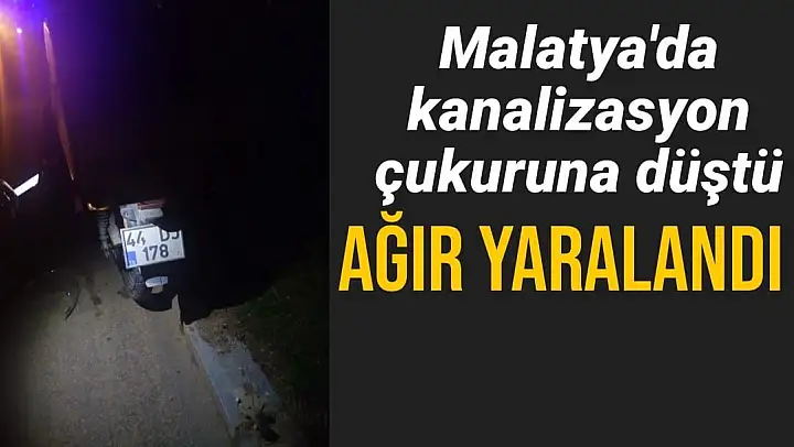 Kaza, 20.50 sıralarında Battalgazi ilçesine bağlı Çamurlu Mahallesi´nde meydana geldi. Edinilen bilgilere göre, Şifa Sokak üzerinde seyir halinde olan B.B. (22) idaresindeki 44 DJ 178 plakalı motosiklet, sürücünün kontrolünden çıkarak yol kenarındaki kanalizasyon çukuruna düştü. Çevredekilerin durumu fark ederek ihbarda bulunduğu olayda yaralı sürücü, Turgut Özal Tıp Merkezi´ne kaldırıldı.