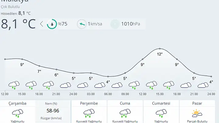 Haftalık tahminlere göre Çarşamba günü yağmurlu hava beklenirken, sıcaklık 4 ile 12 derece arasında olacak. Perşembe ve Cuma günleri ise kentte kuvvetli yağmur etkili olacak, sıcaklıklar 4 ila 12 derece aralığında seyredecek.