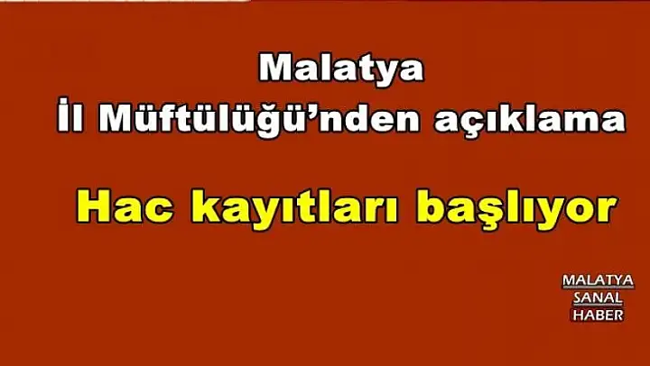 Malatya İl Müftülüğü'nden yapılan açıklamada 2017 yılında hacca gitmek üzere ‘İlk defa kayıt' yaptırmak isteyenlerin ilgili bankalara 20 TL ön kayıt ücretini yatırdıktan sonra müracaatlarını Diyanet İşleri Başkanlığı'na ve müftülüklere elektronik ortamda yada müftülüklere yapabilecekleri belirtildi.