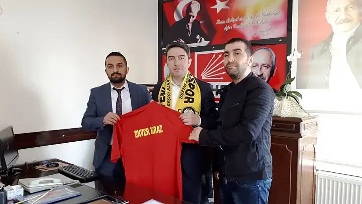 Malatyaspor Taraftarlar Derneği Başkanları Murat Soysal ve Şabi Murat Doğan, CHP Malatya İl Başkanı Enver Kiraz'ı ziyaret ederek takım forması ve atkısını hediye ettiler.