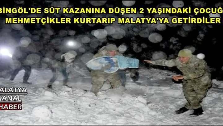 Bingöl'de kar nedeniyle ulaşım sağlanamayan köyde süt kazanına düşerek vücudunda ciddi yanıklar oluşan 2 yaşındaki çocuk, 49. Komando Tugay Komutanlığı helikopteriyle hastaneye ulaştırıldı.