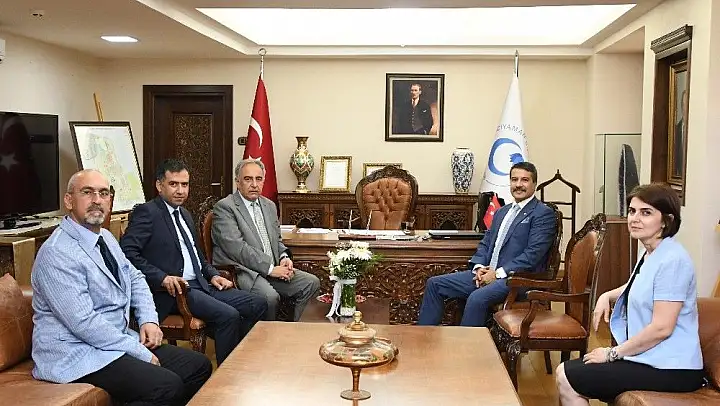 Daha sonra Adıyaman İl Sağlık Müdürü Erdoğan Öz ve beraberindeki heyet, Adıyaman Üniversitesi Rektörlüğüne atanan Prof. Dr. Mehmet Turgut'u ziyaret ederek hayırlı olsun temennisinde bulundu. Halk Sağlığı Hizmetleri Başkanı Dr. Mustafa Kutlu, Sağlık Hizmetleri Başkanı Dr. Nurettin Karakayalı, Kamu Hastaneleri Hizmetleri Başkanı Opr. Dr. Cengiz Yorulmaz, Personel ve Destek Hizmetleri Başkanı Osman Aydın, Halk Sağlığı Hizmetleri Başkan Yardımcısı Dr. Osman Küçükkelepçe, Kamu Hastaneleri Hizmetleri Başkan Yardımcısı Dr. Ali Kaplan ve Kamu Hastaneleri Hizmetleri Başkan Yardımcısı İbrahim Halil Kaya'dan oluşan heyet, Prof. Dr. Turgut'a yeni görevinde başarılar diledi.