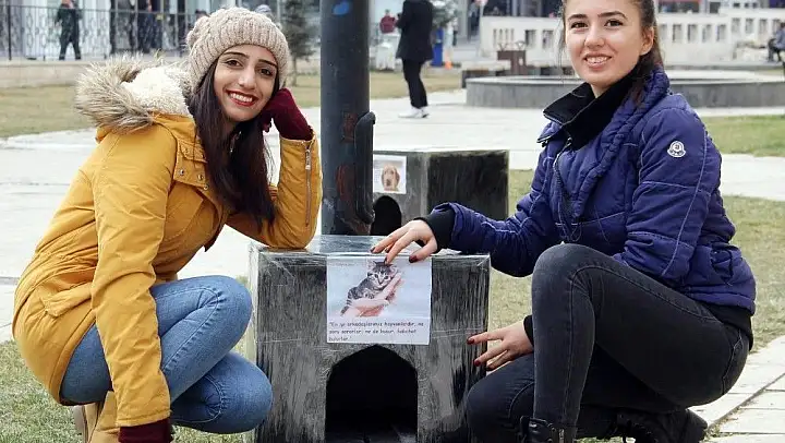 Sivas'ta bir grup üniversite öğrencisi kış aylarında sokakta yaşayan sahipsiz hayvanlar üşümesin diye harçlıklarıyla ve hayvan severlerden topladıkları paralarla korunaklı yuvalar yaptı.