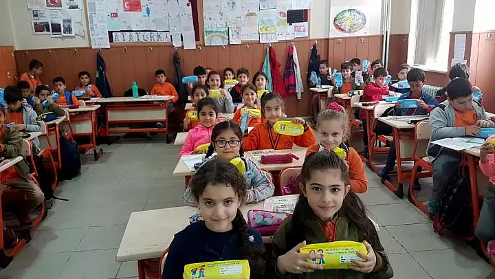 Sağlık Bakanlığı tarafından gönderilen diş macunu ve diş fırçaları ilkokullarda dağıtılmaya başladı.
